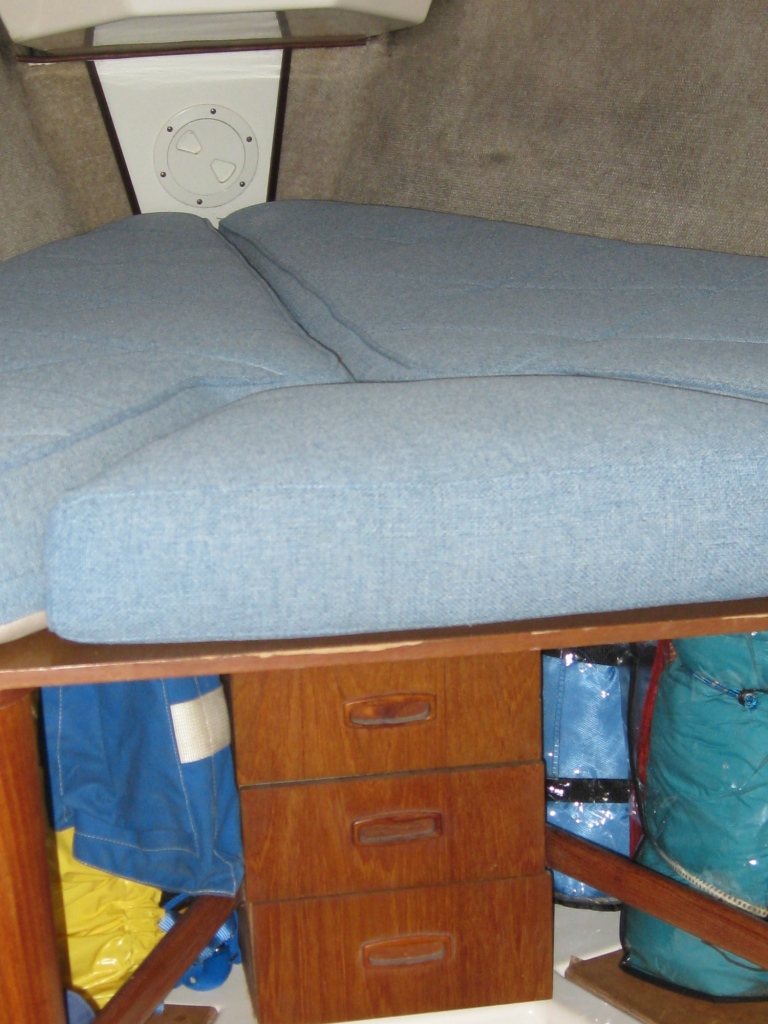 Cabine fermée avec lit double, garde-robe à babord, rangement fermé à tribord et beaucoup de rangement sous le lit.